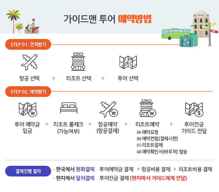 - ① 상품 선택 및 예약금 결제 — 원하시는 여행 일정과 상품을 선택하신 후 예약금을 결제해 주세요. 홈페이지에서 직접 주문하시거나, 상담을 통해 견적을 받으신 후 예약하실 수도 있습니다.